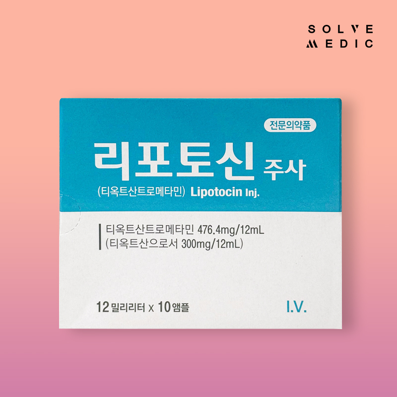 Lipotocin is a high-concentration injectable solution formulated with Thioctic Acid Tromethamine 476.4mg (equivalent to 300mg of Thioctic Acid) per 12mL ampoule. This compound is renowned for its antioxidant effects, metabolic enhancement, and skin rejuvenating properties.